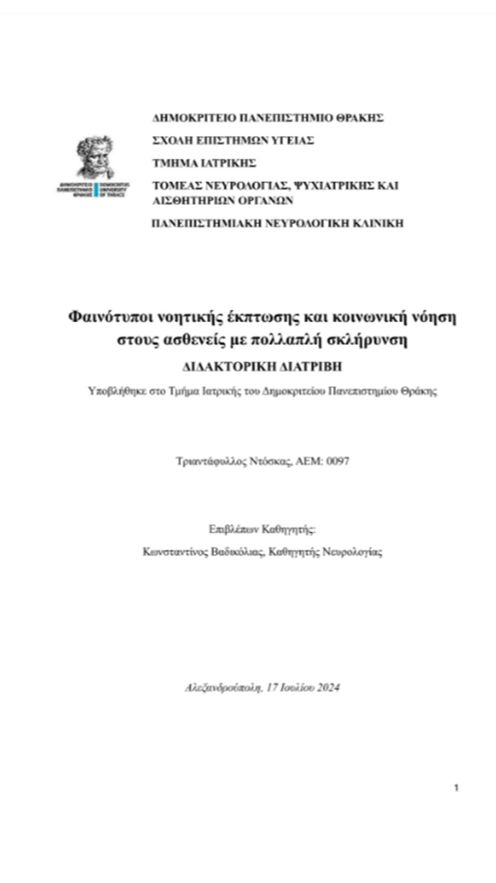 Ντόσκας Τριαντάφυλλος (2024 Δημοκρίτειο Πανεπιστήμιο Θράκης (ΔΠΘ)) Φαινότυποι νοητικής έκπτωσης και κοινωνική νόηση στους ασθενείς με πολλαπλή σκλήρυνση